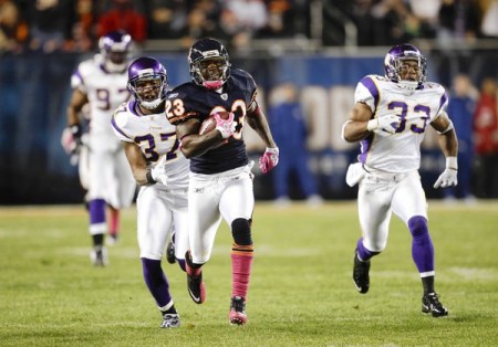 Defense: I have to admit: I thought Adrian Peterson had his I-Pass in his back pocket for this game. Instead, the entire Vikings offense with the exception of that touchdown drive in the third quarter, was AWOL. The Bears defense held Peterson to 12 rushes for 39 yards. I am glad that Peppers played. He kicked ass with two sacks as well as forcing pressure all night on McNabb and later, Ponder. Along with Peppers, the rest of the front four kicked ass and also caused McNabb to be sacked for a safety in the first quarter. And it’s about damn time that Lovie Smith actually did something by benching idiots like Chris Harris and Brandon Merriweather. Major Wright Wrong played alright and Chris Conti didn’t do too bad either. I don’t see a reason why they shouldn’t start next week either. There is nothing to lose. Now if only Tim Jennings (Fuck you) and Charles Tillman (Worthless) can be benched next week, I’d be pretty happy.
