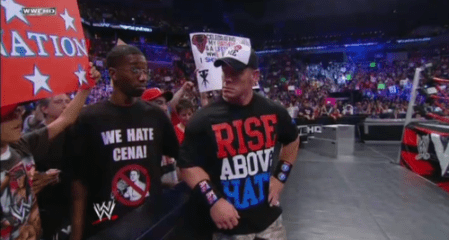 To the turd in the “We Hate Cena” shirt, it’s wrestling. It’s a TV show that’s scripted (It’s still real to me damnit). We get that you hate Cena. A lot of fans do. But the fact that you take this shit seriously by trying to make a “statement” that you hate Cena is probably getting on the other anti-Cena people’s nerves. For myself, I respect Cena as a person and wrestler because of how hard he worked to get to the top. I am probably annoyed as most fans that he continues to hog the main event. But the guy is one of the biggest cash cows for Vince McMahon’s company since the days of Steve Austin and before that, Hulk Hogan. He isn’t going anywhere. So stop making an idiot of yourself. And while you are working on that, go fill out some applications for a job in whatever town/state you reside in. That is, if you even have an education.